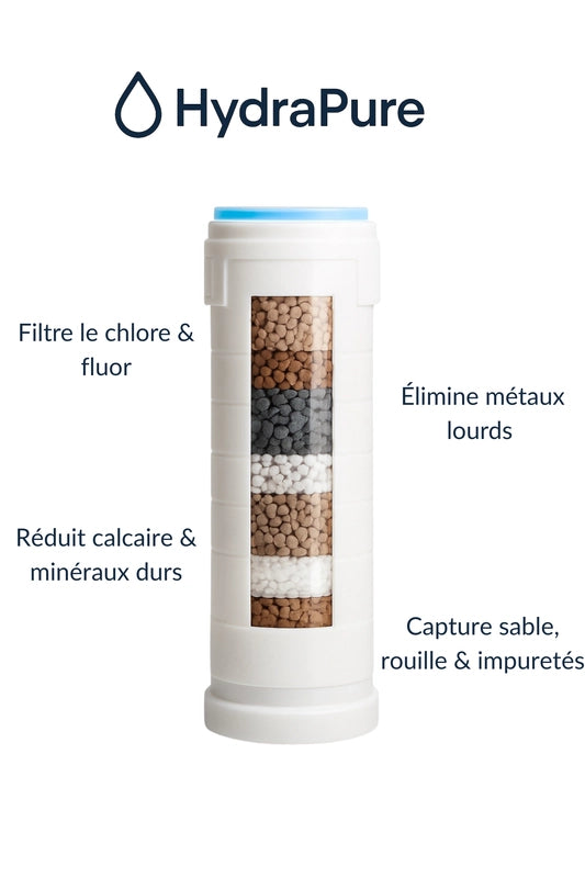 HydraPure filtre efficacement le chlore, le fluor, les métaux lourds (plomb, cuivre…), les résidus de rouille, les particules fines et autres contaminants présents dans l’eau du robinet.